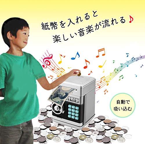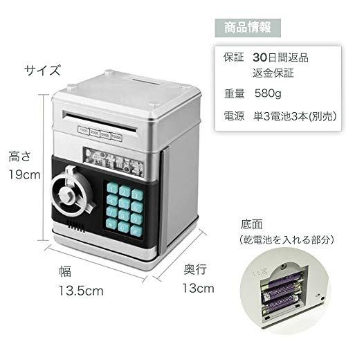 ?【楽しい貯金箱】高品質のABSプラスチックで作られた電子貯金箱です。頑丈で壊れにくい。おもしろインテリアとしてテーブルに置いてみたり、ちょっとしたおもちゃとしても使えます。クリスマスやお誕生日プレゼントにも最適! ?【知育玩具】子どもに貯金の大切さを楽しく育むことができます。また、パスワードロックでの解錠により暗証番号の概念を教育することもできます。そして子供にとって憧れの自動販売機へのお札投入する楽しみ。これ一台で一石三鳥の貯金箱。 ?【使い方は簡単】コインは一番上の投入口から、紙幣は正面上部のスロットから入金できます。紙幣はモーターで自動的に吸い込んでいく機能がついてます。お金を投入すると楽しい音楽が流れます。 ?【パスワードロック】4桁数字パスワードで貯金箱を開封できます。初期パスワード「0000」は変更ができます。扉が開いた状態で*お好きな番号4桁#を押せばセット完了。パスワードを忘れた時は電池を抜き差しでリセットできます。 ?【サイズ】外寸19 x 13.5 x 13cm 、箱内の内容量は12x 10 x 9cm で子供用の貯金箱としても十分な容量。重量(約):580g ※電源:単三電池3本(別売) 30 日間返品・返金保証。