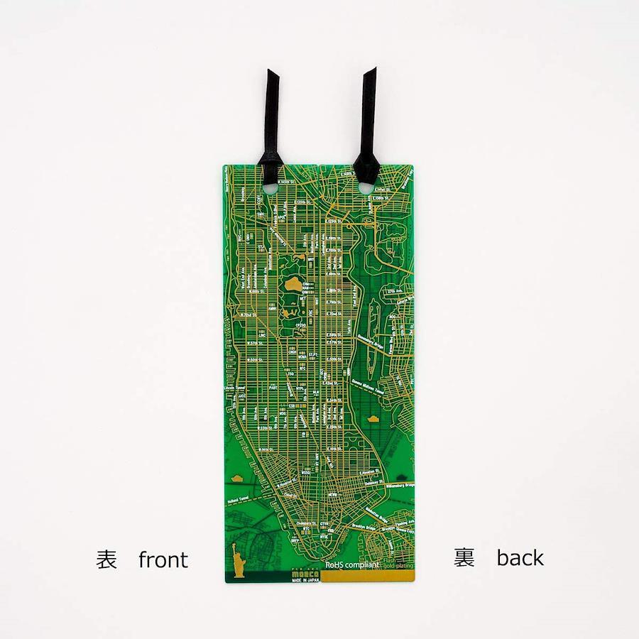 NY回路地図 基板アート 栞は、工業用プリント基板で製造しました。本来の基板と同じ材料、工程、製造方法で製造している栞です。本や手帳、そして手を傷つけないよう基板の端面より0.15mmの銅箔を削除しています。0.3mm厚の基材を使用していますが、金メッキや両面のレジストインクとシルク文字を合わせると、仕上がり総厚は0.45mmになります。──────────デザインソフトではない基板専用CADを使い、マウスで一本一本線を引き作画しています。細い線では0.1mmの配線パターンで緻密にデザインされています。──────────NY回路地図デザインは、プリント基板の配線パターンでニューヨーク・マンハッタンの地図を描きました。主要建造物や美術館、主要な通り名称はシルク文字で表記しています(例:ESB=エンパイヤステートビル)。マンハッタン島沖には自由の女神像を金メッキで表現しています。──────────緑・黒・白・ピンク色は、回路パターンを保護する絶縁膜となるインクです。ちなみに、緑色のレジストインクは日本で一番使用されています。日本で設計、製造しており、全ての商品はRoHS対応品(鉛不使用商品)です。基板は金メッキ処理をしています。──────────【ご注意】・電子部品は実装されていません。・緑色のレジストインクは透過性があるため裏側が少し見えます。・栞は透明袋に包装します。(ギフトボックス梱包ではありません)・受注順に出荷させていただきます。──────────■製品仕様NY回路地図 基板アート 栞価格 32,000円(税込)カラー :緑・黒・白・ピンクサイズ :140mm×32mm×0.45mm重さ :3g使用電子部品:無し