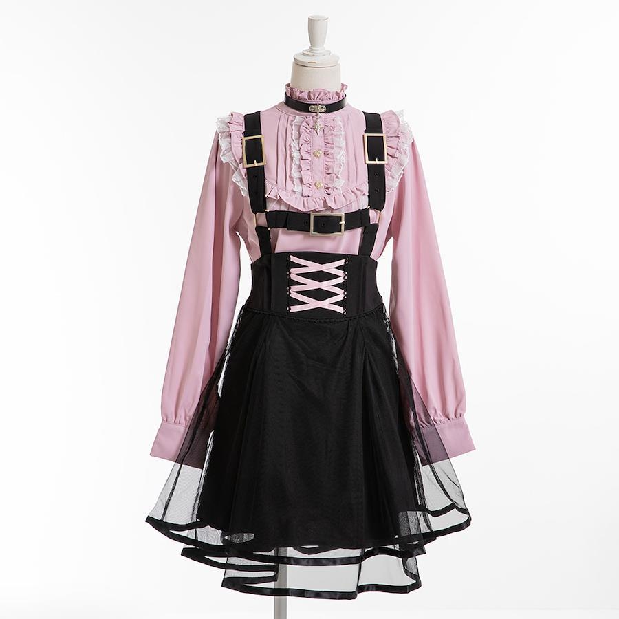 【デザイン】ルビーのかわいらしさからインスパイアを受けた、フリルとレースがたっぷりのピンクブラウス。セットのチョーカーで小悪魔さもアップします◎セットのチョーカーには瞳を表したキラキラチャームが…!スカートはちょっぴりハードめなベルトをたくさん付け、可愛さだけじゃない内面が表現されたデザインです。スカートはゴム無しで綺麗なシルエットにこだわりました。