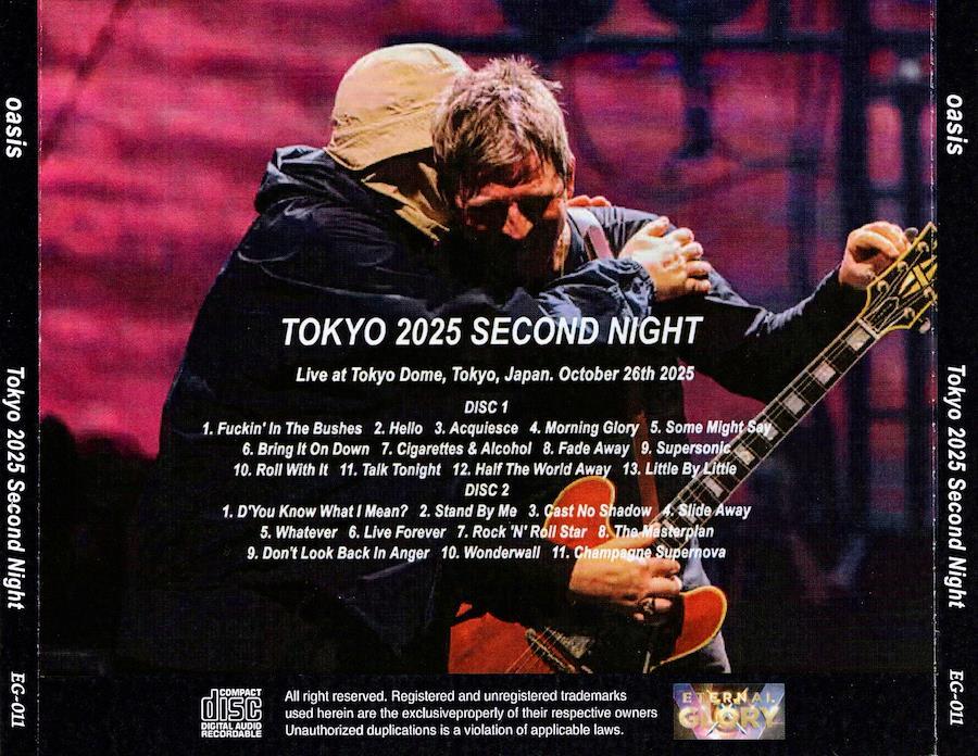 全世界を熱狂の渦に巻き込んだ再結成オアシスの実に16年振りとなる来日公演より、2025年10月26日の東京ドームで行ったライブを極上レベルの高音質オーディエンス録音で完全収録。アリーナ前方付近から音圧豊かなステレオ感のあるダイレクトなサウンド。煌めく名曲と共にリアム&ノエルの兄弟が帰ってきた再結成オアシスの非の打ち所のない素晴らしい感動のライブを高音質サウンドで存分にお楽しみ頂けます。