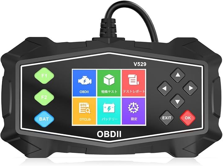 自動車用診断スキャナーには9つのボタンがあります:上下、左右、確認/戻る、そして専用のF1(I/M準備)、F2(カーボンチェック)、BAT(バッテリーテスト)ボタン。