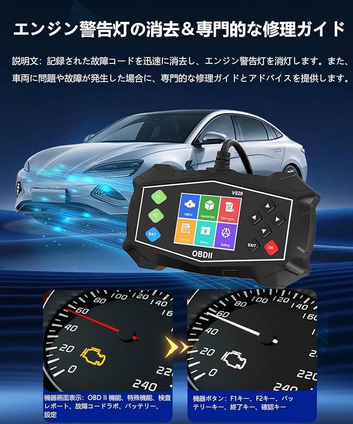 この車両診断ツールを使用すれば、故障コードを自分で確認し、コードの定義を表示できるため、愛車を修理工場に持って行く必要がありません。
