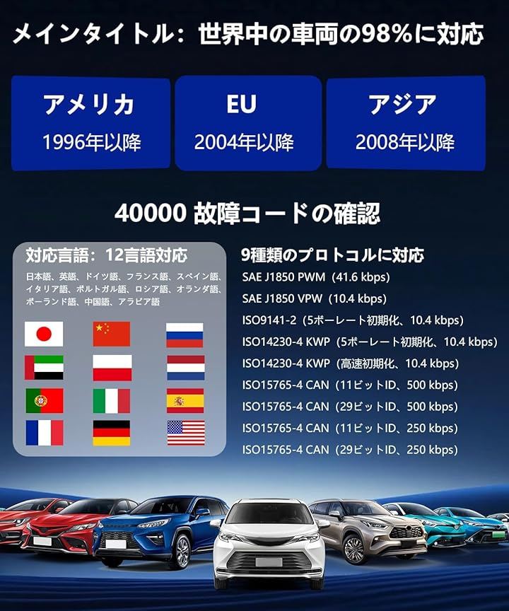 このOBD2自動車故障コードリーダーは12言語に対応しています:英語、ドイツ語、フランス語、スペイン語、イタリア語、ポルトガル語、ロシア語、オランダ語、ポーランド語、日本語、中国語、アラビア語。