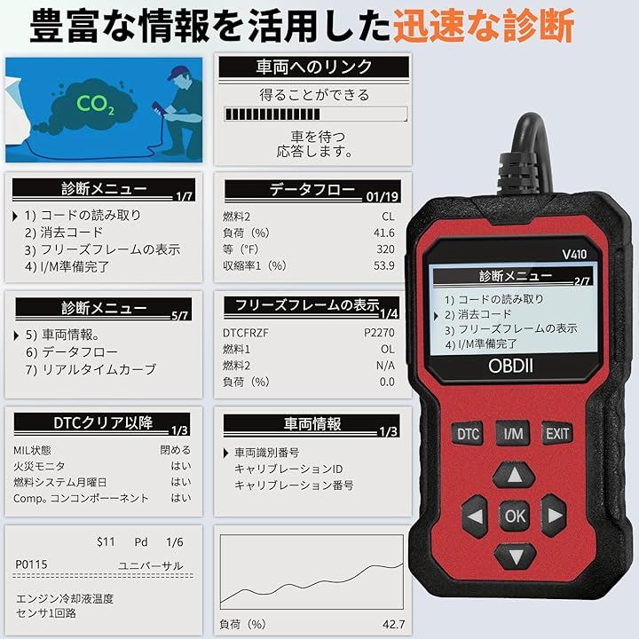 多機能:この自動車診断ツールはミニメカニックのようなもので、エンジン故障コードの読み取りとクリア、リアルタイムデータストリーム(グラフィカル表示付き)、フリーズフレームの表示、MIL準備状況の確認、I/M監視の準備状況の読み取り、車両情報の収集により車両表示の詳細を表示できます。