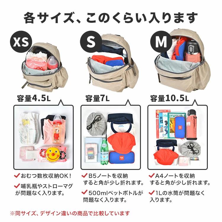 ■サイズ[XS]本体:縦24×横18×マチ9cmフロントポケット:縦9.5×横14×マチ2.8cm内ポケット:縦7×横7cm[S]本体:縦30×横22.5×マチ10.5cmフロントポケット:縦14×横19×マチ3cm内ポケット:縦9.5×横10cm[M]本体:縦34×横24×マチ12cmフロントポケット:縦15×横20.5×マチ3.5cm内ポケット:縦10.5×横11cm
