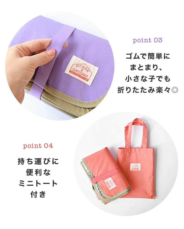 【レジャーシート [GOODAY]】子供服やベビー用品で人気のブランドオーシャンアンドグラウンドから、おしゃれな無地のレジャーシートが登場!大人なら一人、子供なら二人が座れるくらいのコンパクトサイズです。折りたたんで付属のミニトートバッグに収納できます。裏地はアルミ生地で湿気や冷気に強くなっております。湿った土の上に敷いてもお尻が冷たくならない優れもの。お子様の遠足や、ちょっとしたピクニックにピッタリです!さらにコンパクトサイズなのでリビングやベランダにも敷きやすいです。お家でピクニック気分が味わいたいときにもおすすめです!!