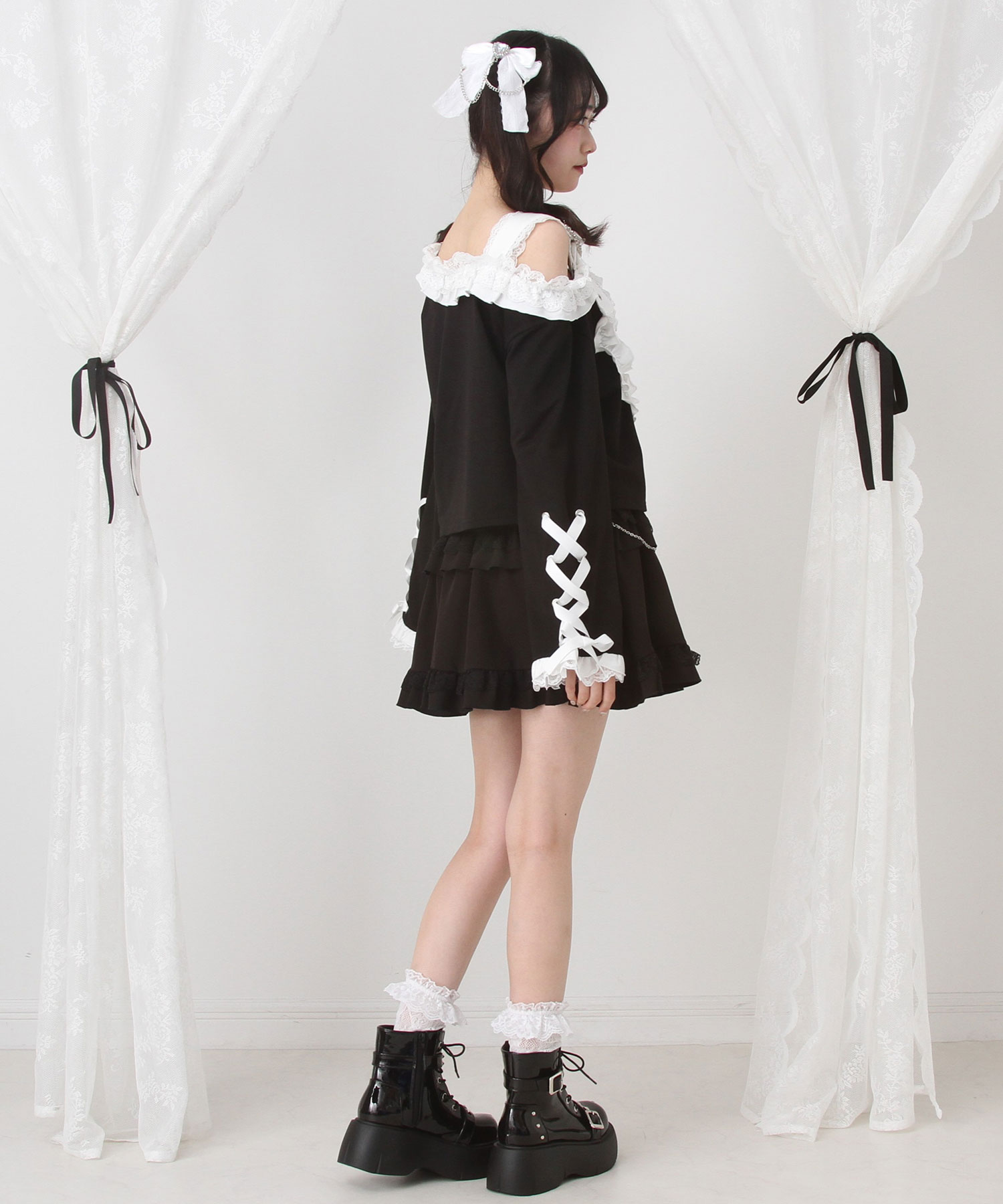 袖部分のレースアップや裾のフリルも、細部までこだわった可愛らしさを演出。