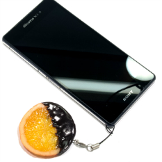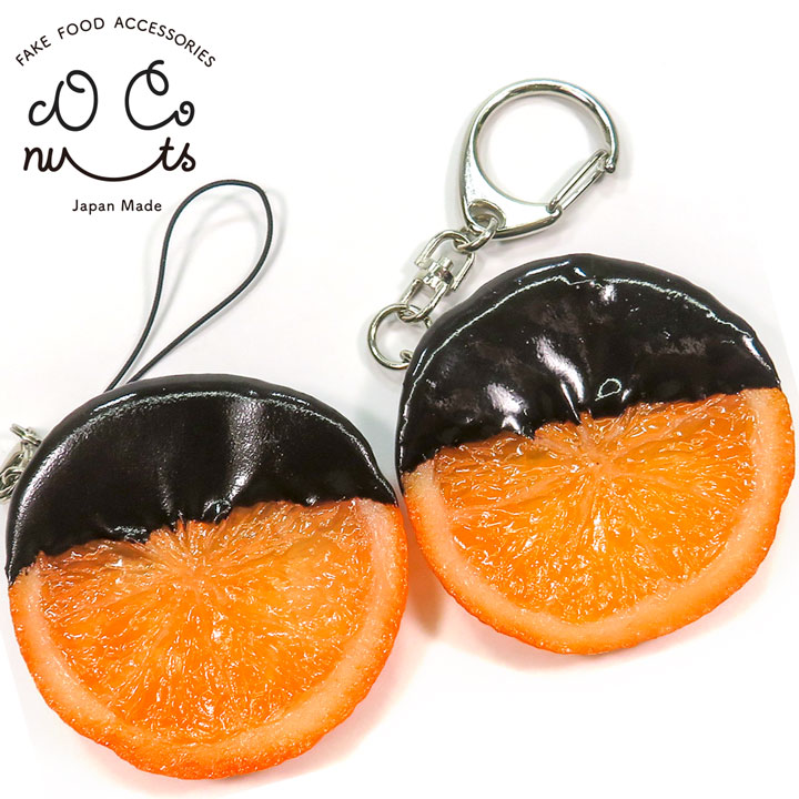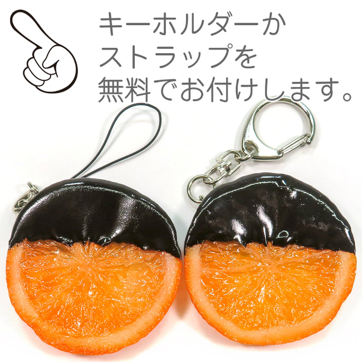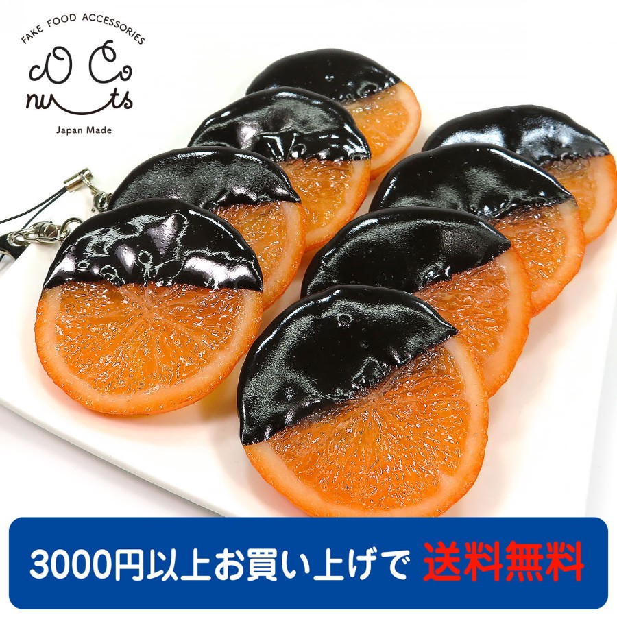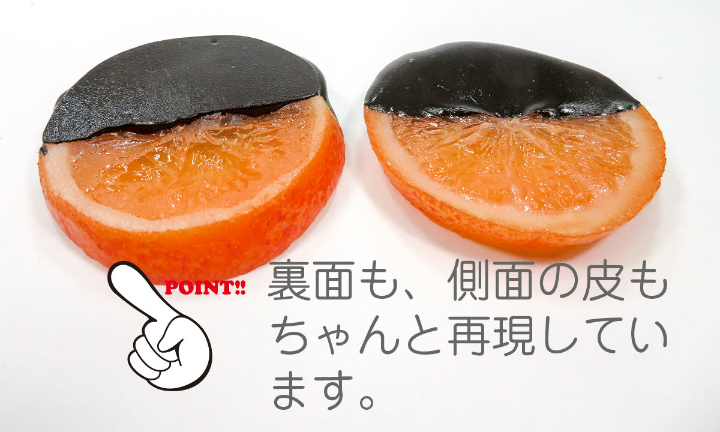 砂糖漬けのオレンジをチョコがけにしたオランジェットの食品サンプルです。食品サンプルなんだけど、裏側もちゃんと再現されている、こだわりの作りです。