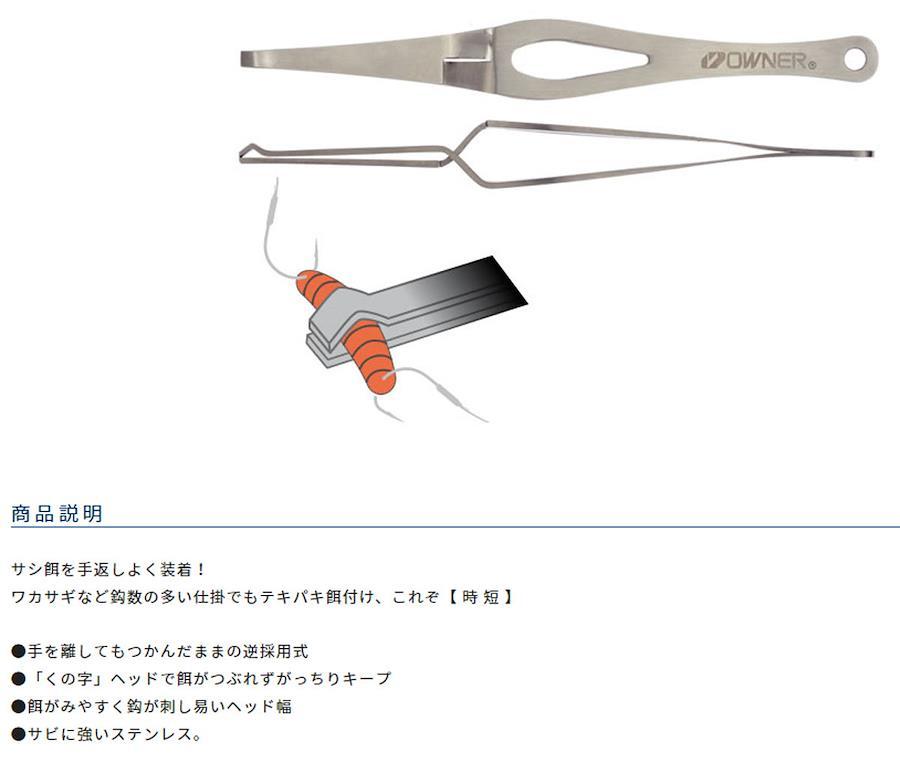 サシ餌を手返しよく装着!!ワカサギなど針数の多い仕掛けでもテキパキ餌付け、これぞ【時短】●手を離しても掴んだままの逆作様式●「くの字」ヘッドで餌がつぶれずがっちりキープ●餌が見えやすく針が刺し易いヘッド幅●サビに強いステンレス。(日本製)