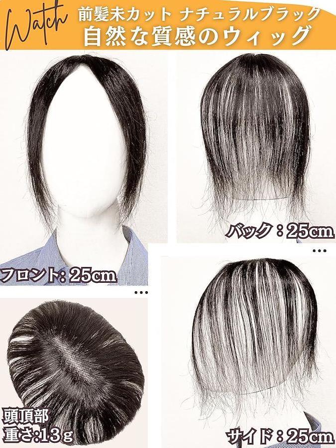 「商品詳細」(3)サイズ:ベース 縦8x6cm (4)重さ:約14g (5)カラー:ナチュラルブラック (6)デザイン: 前髪カット フロント13cm バック25cm サイド25cm (7)用途: うぃっぐ 部分ウィッグ かつら 中高年 ハゲ隠し