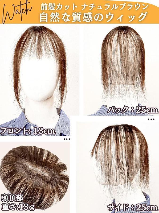 「商品詳細」(3)サイズ:ベース 縦8x6cm (4)重さ:約14g (5)カラー:ナチュラルブラウン (6)デザイン: 前髪カット フロント13cm バック25cm サイド25cm (7)用途: うぃっぐ 部分ウィッグ かつら 中高年 ハゲ隠し