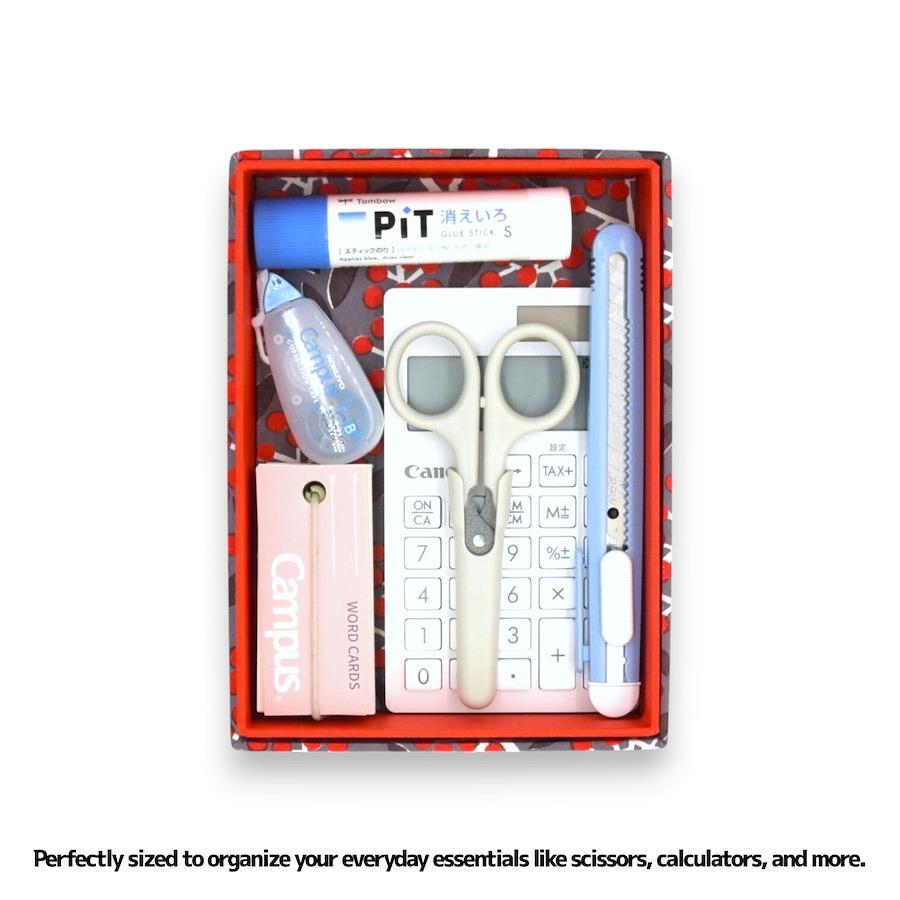 貼り箱ケースは、ハサミや計算機、のり、カッターなど、さまざまな文房具が収まるちょうどよいサイズ感。