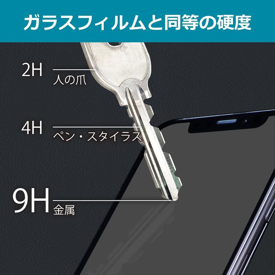 ■表面硬度 9Hなのにしなやかなフィルム表面硬度はガラスフィルムと同等の9Hですが、しなやかな柔軟性がある「超ハードコートPETフィルム」なので衝撃を受けても割れません。厚みも一般的なガラスフィルムより薄い約0.2mmでタッチ操作の感度も良好です。(※1)