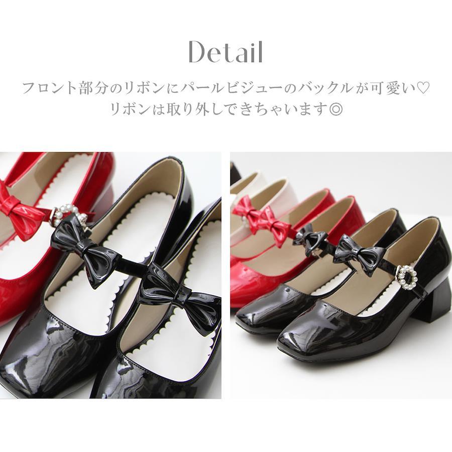 パールバックルリボンパンプスのご紹介。【デザイン】パールバックルとストラップのリボンがポイントのレディライクなパンプスです。バックル部分は引っかけ仕様で着用いただける仕様になっています。ストラップは3段階で調整可能。ヒールの形は少し角があり、つま先は丸みのあるスクエアトゥで程よく甘さをプラス◎ストラップのリボンは、取り外しが可能です。