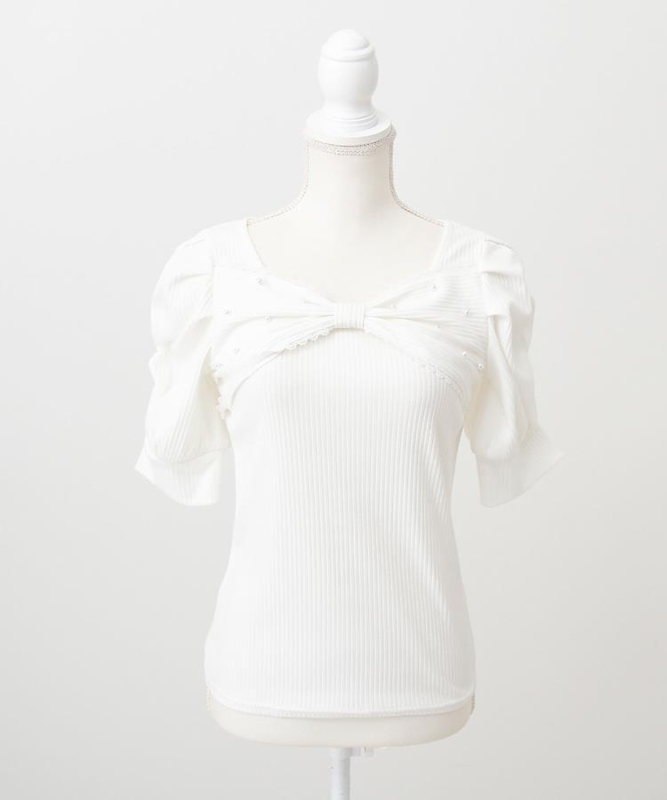 胸元にリボンデザインが大きくあるリブカットトップスです。