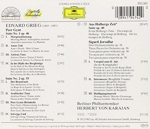 This is a very convenient and reasonably priced collection of Grieg's best-known orchestral music. Well-recorded, it's played by one of the world's great orchestras under the direction of one of the world's best-known conductors. If that's all you need to know, and especially if you are planning to use this disc for background music, you can buy it with confidence. If you want incisive characterization of the music, though, you should probably look elsewhere. Karajan applies a uniformly lush sound to the music, smoothing off the rough edges and making everything sound nice. It's not all supposed to sound nice. In a more extensive selection of "Peer Gynt" music, Sir Thomas Beecham brings out more character in the music, as does Leonard Bernstein in the standard suites. "From Holberg's Time" has a deliberately antique, courtly element that vanishes under the Berlin's wall of sound. The Orpheus Chamber Orchestra brings out this character more effectively. And if you want an even more extensive and reasonably priced Grieg orchestral collection, with a less fine orchestra but more character, try Abravanel/Utah on Vox. --Leslie Gerber