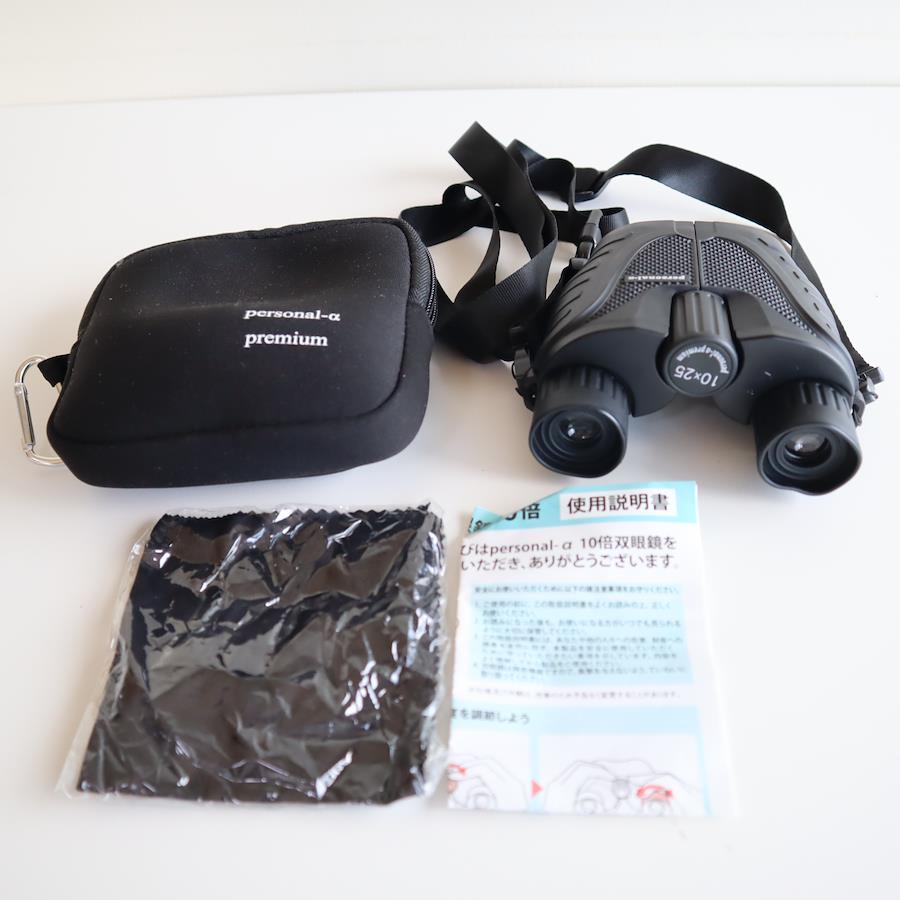 【詳細】■ 商品名・モデル:personal-α premium 双眼鏡 10×25■ ブランド:personal-α(パーソナルアルファ)■ カラー:ブラック■ 状態:- レンズ・ボディともに目立つ傷なし- 使用感少なく美品のコンディション- 動作(ピント調整)良好■ 付属品:専用ケース、レンズクロス、取扱説明書、ストラップ■ サイズ:コンパクトタイプ/軽量モデル