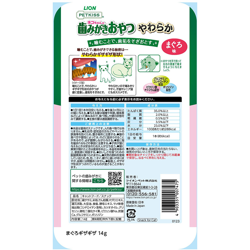 ・かたいおやつが苦手なネコのためのやわらかいまぐろ味の歯みがきおやつです。・ギザギザ形状が歯に密着!噛むことで歯垢を除去し、歯の健康を維持します。・1日1回はおいしい歯のケアをしましょう・メーカー獣医師と共同開発