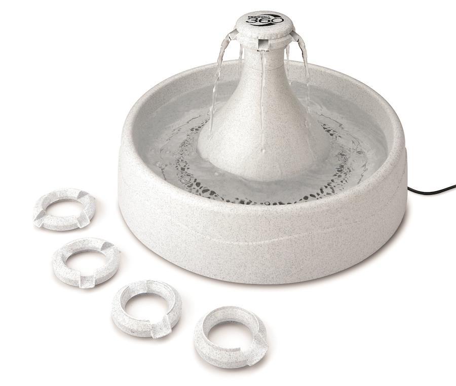 特徴:・コントロールキャップにより水量調整可能。 ・交換可能な噴出口リングによって5種類まで流し方を変えられます。 ・流れ落ちる水を受ける斜面板によって跳ねや水の音を静めます。 ・水中ポンプですので運転が静かです。 ・インラインプラグ付の12V低電圧システムから簡単にポンプが取り外せます。 ・大型3.8L容量。 ・フォームフィルター、活性炭フイルター各1個付き。製品仕様:材質:プラスチック 電源:100V 50Hz/60Hz原産国:中国