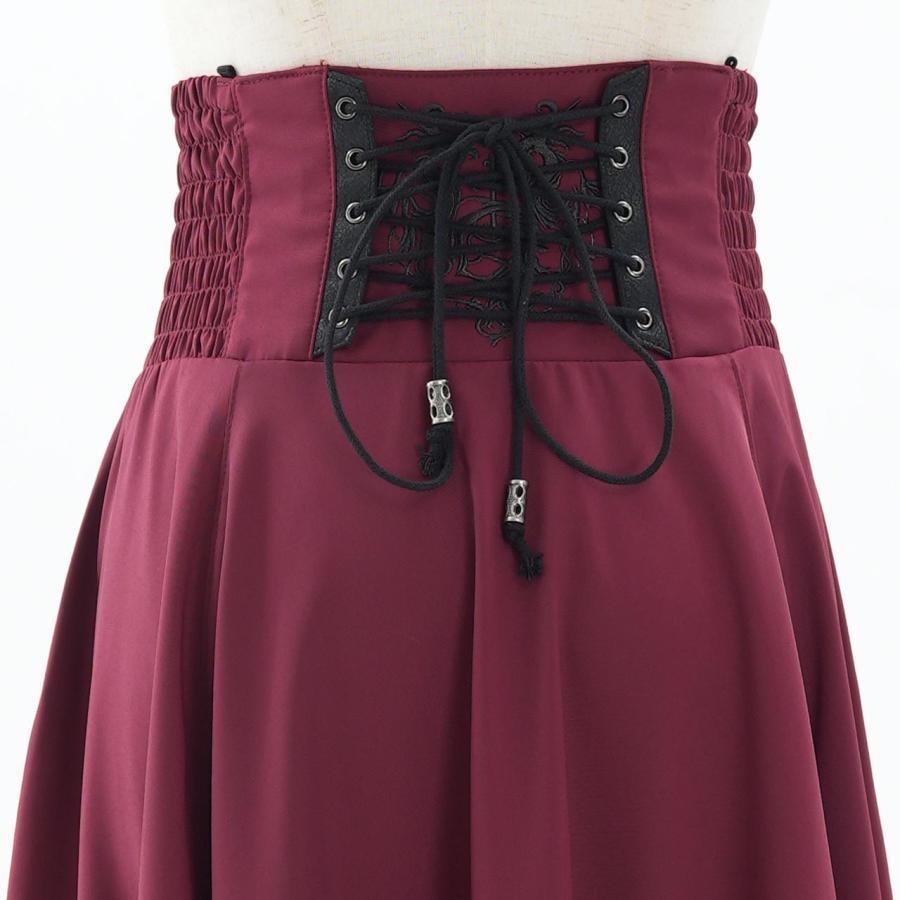 永久に紡ぐ、幻影の残響の世界漂うクローチェのロングSK!!脇はシャーリング仕様の為、容易に着脱いただけます。後身のレースアップで、お好みでサイズ調整いただけます。スカート内側にテープを縫い付けており、お好みでデザインアレンジをお楽しみいただけます。ロング丈の為、日常で使用し易く、様々なコーディネートにも併せ易い為、大変おすすめのアイテムになります。