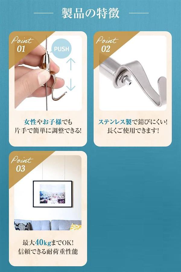 「製品性能」長さ0.5m~1.5mのステンレス製ワイヤーは、優れた防錆性と耐久性を備えており、使用荷重は約40kgです。