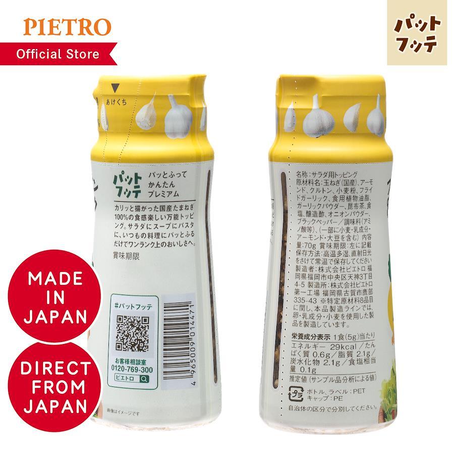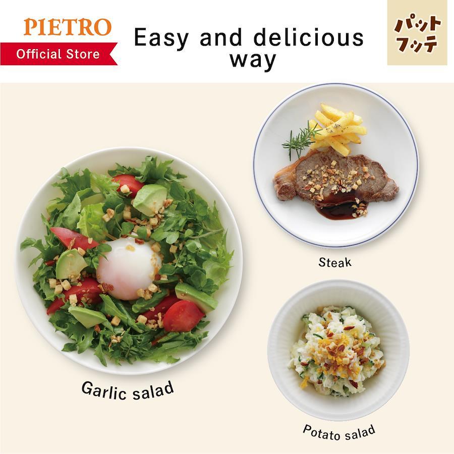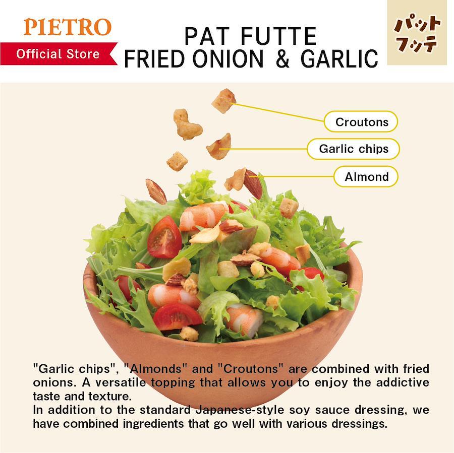 ピエトロドレッシングと同じ、100%国産のたまねぎで作るフライドオニオンに、「ガーリックチップ」「アーモンド」「クルトン」を合わせた、クセになるおいしさと食感を楽しむことができる万能トッピングです。いつものサラダやパスタ、ポテトサラダをはじめ、ステーキにかけるだけで旨みと食感がプラスされ、ワンランク上のおいしさに早変わりします。