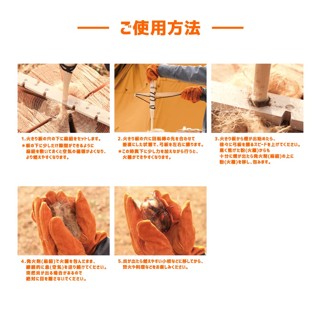 弓きり式の火起こし棒で、自力で火を起こす。その楽しさがこの1セットで体験できます。キャンプやバーベキューなどで、お子様やお友達とチャレンジすれば盛り上がること間違いナシ。サバイバル体験の入門編として、火を起こす大変さや、知育体験としてもご使用いただけます。別売りのマイギリ式セットと合わせて、比較するのもオススメです。※お子様と使用する場合は、必ず保護者の方と一緒に使用してください。
