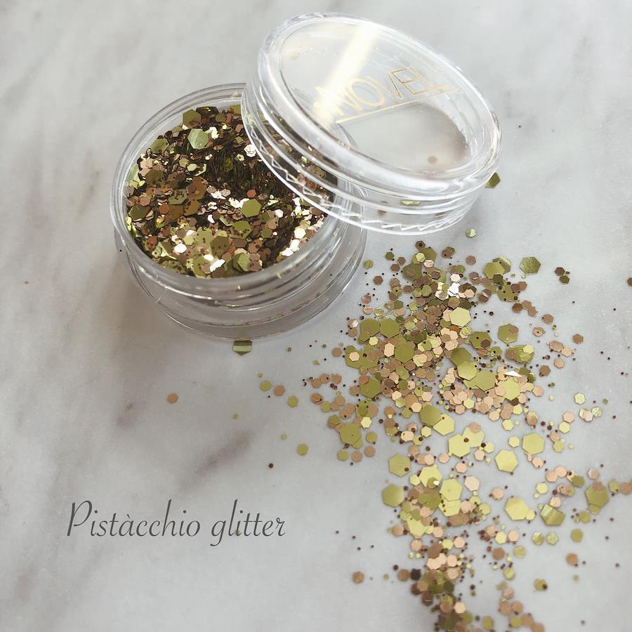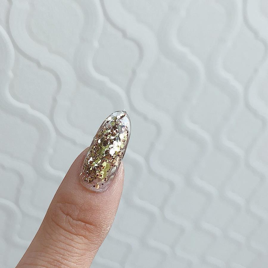 少し淡いライトグリーンのホロにシャンパンゴールドとブラウンのラメが入った、インパクトのあるジュエリーのようなラメグリッターです。