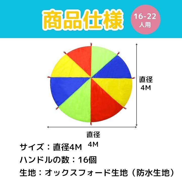 「プレイパラシュート 仕様」 サイズ:直径4M (主に16-22人で遊べます)ハンドルの数:16個 生地:オックスフォード生地(防水生地)