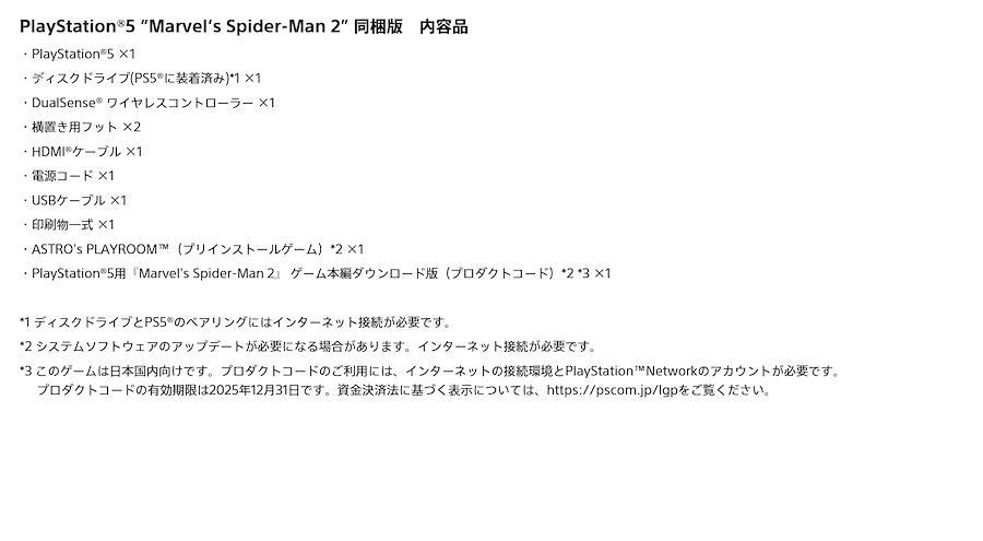 ・PlayStation?5 ×1 ・ディスクドライブ(PS5?に装着済み)*1 ×1 ・DualSense? ワイヤレスコントローラー ×1 ・横置き用フット ×2 ・HDMI?ケーブル ×1 ・電源コード ×1 ・USBケーブル ×1 ・印刷物一式 ×1 ・ASTRO's PLAYROOM?(プリインストールゲーム)*2 ×1 ・PlayStation?5用『Marvel's Spider-Man 2』 ゲーム本編ダウンロード版(プロダクトコード)*2 *3 ×1 *1 ディスクドライブとPS5?のペアリングにはインターネット接続が必要です。 *2 システムソフトウェアのアップデートが必要になる場合があります。インターネット接続が必要です。 *3 このゲームは日本国内向けです。プロダクトコードのご利用には、インターネットの接続環境とPlayStation?Networkのアカウントが必要です。プロダクトコードの有効期限は2025年12月31日です。資金決済法に基づく表示については、https://pscom.jp/lgpをご覧ください。