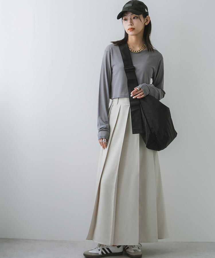 安心のロング丈はどんなトップスとも合わせやすいデザイン。