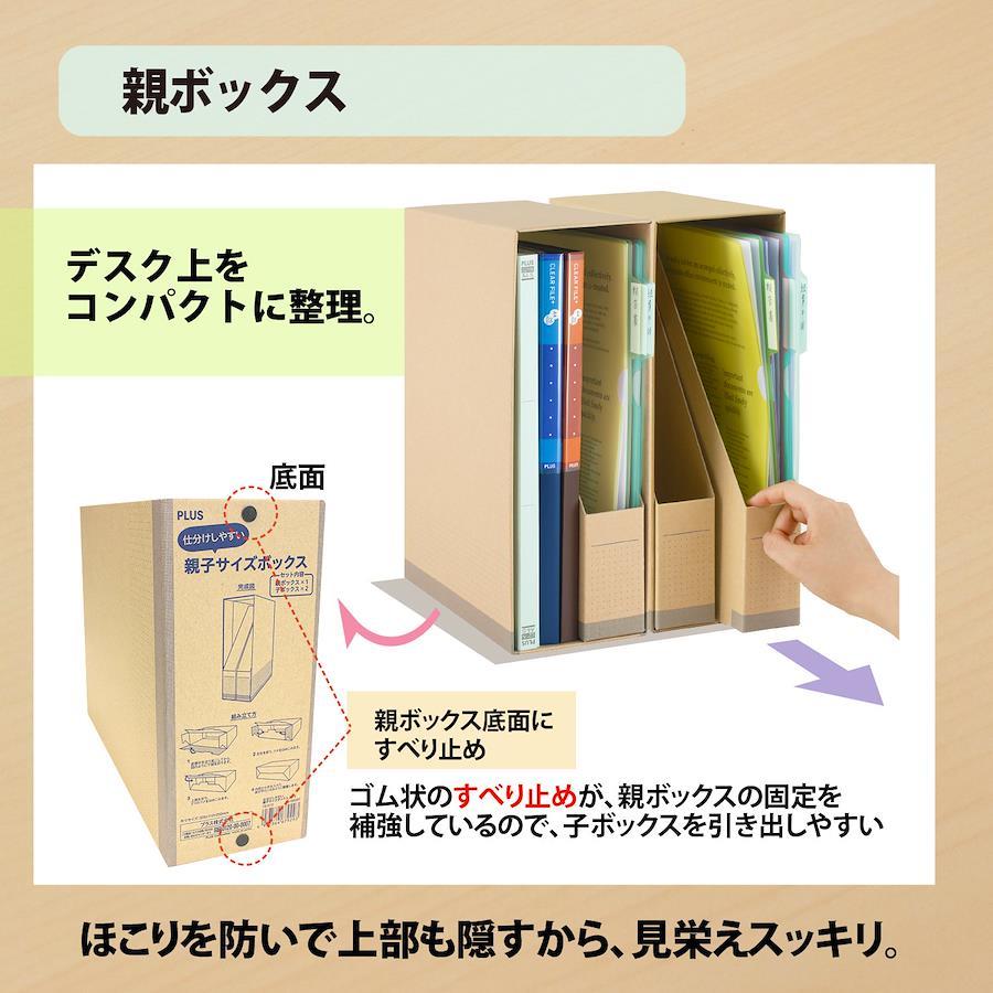 1. 「親ボックス」+「子ボックス」2つのサイズで仕分けがしやすい・書類の一時保管や、よく使うファイルなどを2つのボックスでキレイに収納・ファイルなどとセットで、デスク上をコンパクトにすっきり整理