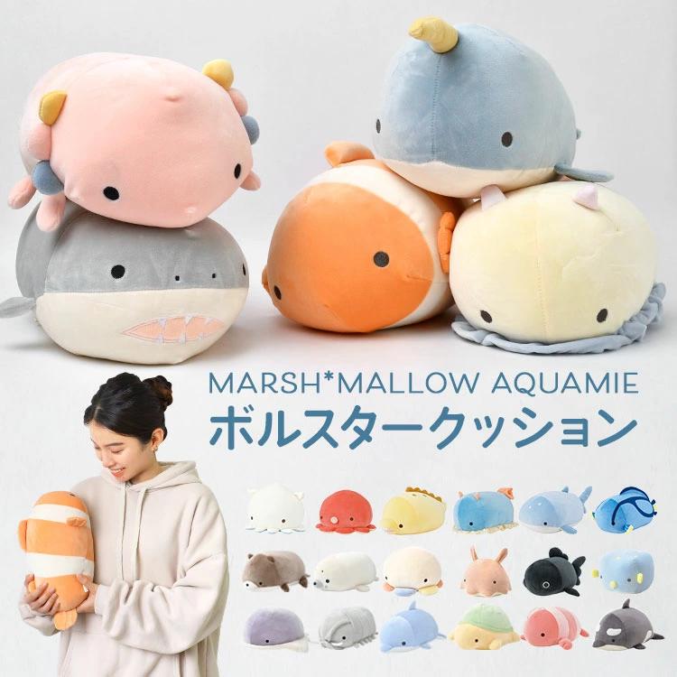 ぬいぐるみ 抱き枕 マシュマロアクアミエ ボルスター 海の生き物 イルカ カワウソ サメ シャチ メンダコ ジンベエザメ カメ ウミウシ クラゲ イカ タコ エイ クマノミ 魚 抱きまくら クッション かわいい もちもち [lib-aquamie-ms-b]