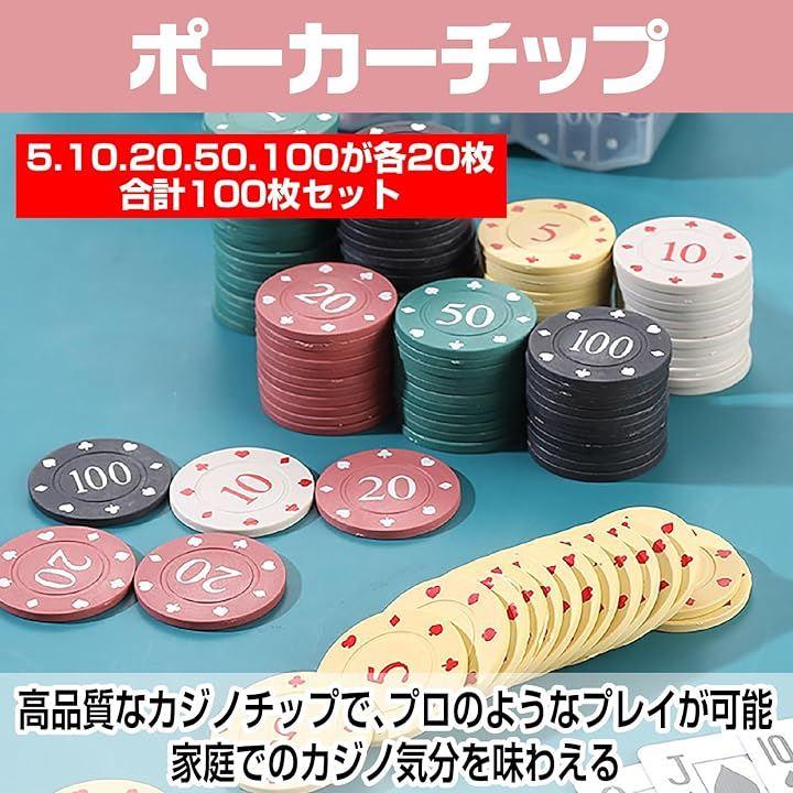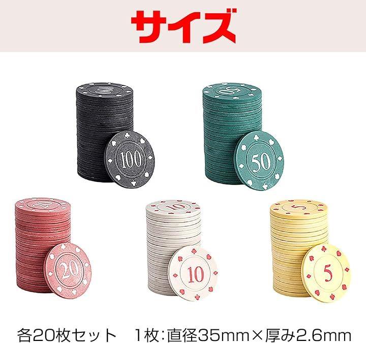 「ポーカーチップ 仕様」 *枚数:100枚入り 収納ケース付き *サイズ1枚:直径35mmx厚み2.6mm 素材:プラスチック *モニターの環境により、色の見え方に若干差が生じる場合がございます。