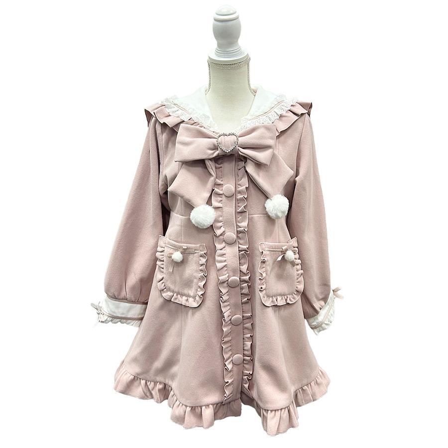 かわいすぎるセーラーフリルコートが新しくなって登場♪【デザイン】人気のセーラー襟デザインのかわいいAラインコートが新しくなって登場♪ポンポンリボンがかわいく、冬にぴったりのデザインになっています。フリルたっぷりで、襟にはレースがあしらわれていてどこを見てもかわいいデザイン。後ろには大きめリボンがついています。袖口、ポケットリボンは安全ピンで取り外し可能です。前立てのスナップボタンで着用が可能です。襟リボンは安全ピンで取り外し可能です。【素材】重みのある、ウールタッチの素材を使用しています。中綿などは入っていないので、着ぶくれしにくい素材感です。《透け感》なし 《生地の厚さ》普通 《裏地》あり 《伸縮性》なし《生産国》中国