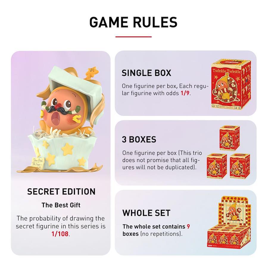 【Twinkle Twinkle The Gifts From Stars シリーズ】Twinkle Twinkle(トゥインクルトゥインクル)は、全ての贈り物に星のような暖かさと喜びをもたらします! 【各キャラクター名称】A Big Hug Make a Wish Fortune Cookies Handwritten Gift Happy Trumpeter Star Jar Snowman Friend Lovely Puppy Star Apple The Best Gift 【仕様】1ピース 【入数】1ピース入り 【種類数】ノーマル9種+シークレット1種 【商品サイズ】高さ約84-98mm、幅約50-83mm 【素材】PVC/ABS/電子部品 【ご注意】※ピース購入の場合、種類は選べません。複数購入いただいても内容が重複する可能性がございます。 ※シリーズを一通りそろえたい方はアソートボックスの購入をお願いいたします。 ※シークレットは一定の割合でアソートボックスへ封入されているため、アソートボックスで購入いただいても手に入らない可能性がございます。 ※海外仕入商品の為、多少の箱潰れが発生する可能性がございます。箱潰の交換は出来かねます。ご了承ください。 ※お客様都合によるご注文のキャンセル・返品・交換は原則不可とさせていただきます。 【交換対応につきまして】※商品に塗装剥げや破損等の不具合があった場合、商品到着後7日以内にお問い合わせください。状態をお伺いのうえ対応させていただきます。 ※フィギュア本体、パーツのみ対応可能です。キャラクターカードはサポート対象外となります。予めご了承ください。 ※ご購入履歴の確認が取れない場合は、対応不可となります。