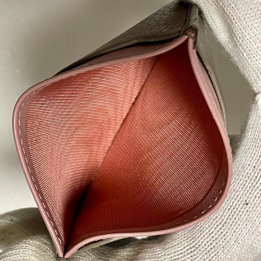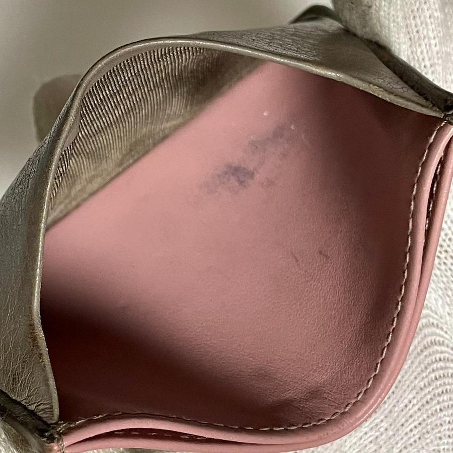 ロゴ金具:正面ロゴの金メッキ部分に、一部剥がれや変色が見られます。外側: 角やフチにスレ、黒ずみ、および糸の飛び出しが一部ございます。内側: ピンクのレザー部分に、インクのような黒っぽい汚れが複数箇所ございます。内側の布/メッシュ素材部分に、カードの出し入れに伴う毛羽立ちが見られます。