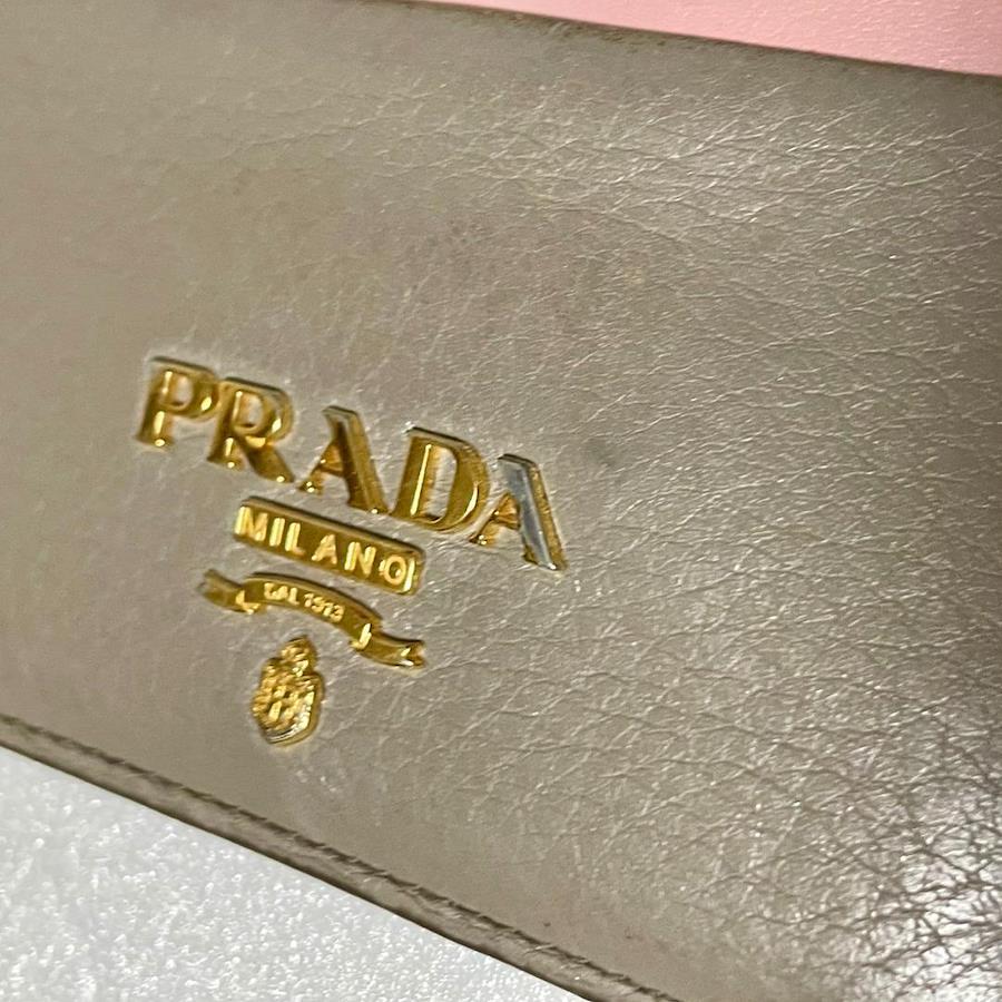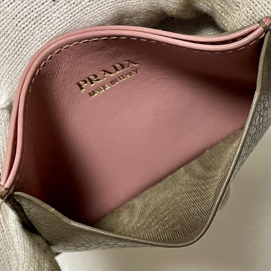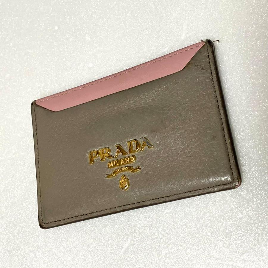 ☆こちらの商品はUSED品ですので新品や未使用品をお求めの方はご遠慮ください。グレーとピンクのレザー製カードケース、ゴールドのPRADAロゴ付き。