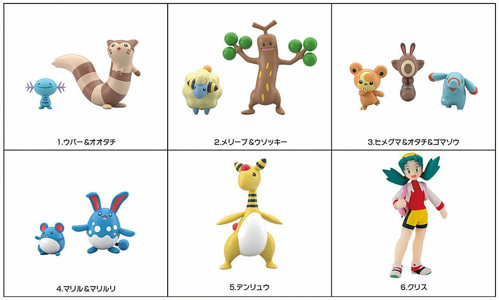 今弾はジョウト地方の第2弾です。ポケモントレーナーのクリスに加え、ウパー、ウソッキー、ヒメグマ、ゴマゾウ、マリルとマリルリ、オタチとオオタチ、メリープとデンリュウをはじめとしたジョウト地方のポケモンたちが登場!ポケモンのサイズ差を楽しんでいただけるラインナップになっています。