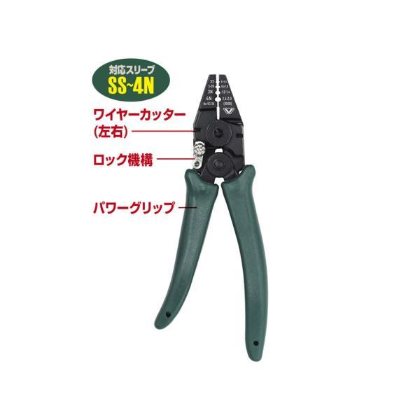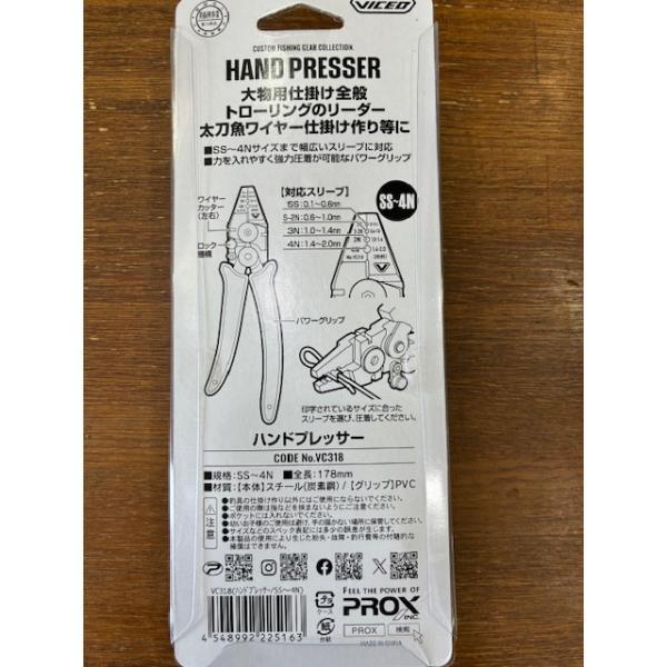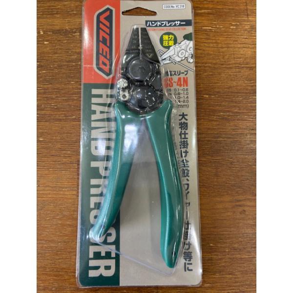 大物仕掛け全般、ワイヤー仕掛け等に大物用仕掛け全般に活躍するハンドプレッサー。SS〜4Nサイズまで幅広いスリーブに対応。力を入れやすく強力圧着が可能なパワーグリップ。左右にワイヤーカッター、ロック機構搭載。トローリングのリーダー、太刀魚ワイヤー仕掛け作り等に最適。