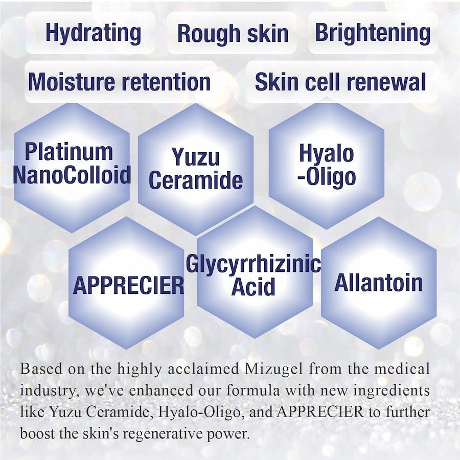 高い保湿力で肌の水分の保持力を高めるとともに肌が本来持つ修復能力をサポート、ハリのあるきめ細やかな肌へと導きます。さらに10億分の2メートルにまで超微小化した“白金ナノコロイド”を配合することで、透明感のある肌に導きます。しかも、香料や防腐剤、乳化剤など化学物質は使用していませんので、安心してご使用いただけます。