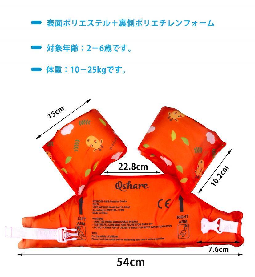 浮き輪 アームリング 【高品質な素材】Qshare子供用の水泳アームリングは腕用浮き輪が付いた子供用の遊泳補助具です。表面(ポリエステル)と特殊浮力素材(ポリエチレンフォーム)の高品質な素材を採用します。両腕を通して使用するので動きやすくて、水遊び、水泳の練習などに最適です。 【簡単に装着】この子供ライフジャケットは調節可能な安全バックル付き、着やすくて、腕を通して背中側のバックルを固定するだけで装着できます。腕は通しやすく泳いでいるときにも抜けません。ストラップは体のサイズに合わせて調整できます。 【適用範囲】年齢:2歳から6歳まで、浮力は14-25キロに達します。体重:10-25kgです。男女兼用の水泳練習補助具です。 【適用シーン】幼児用ライフジャケットは男の子と女の子の水遊び、釣り、漂流、マリンスポーツ、カヌー、小型船舶やプレジャーボート、水泳練習などに大活躍です。ご注意:子供が大人の視線を離れないでください。子供は保護者の監督なしでは使用できません。スイミング補助具ですが救命製品ではありませんので、ユーザーに浮力アシストを与えるだけです。 【安心保証】お客様の使用体験を第一に、ご購入後に商品に問題がございましたら、ご遠慮なくお問い合わせください。