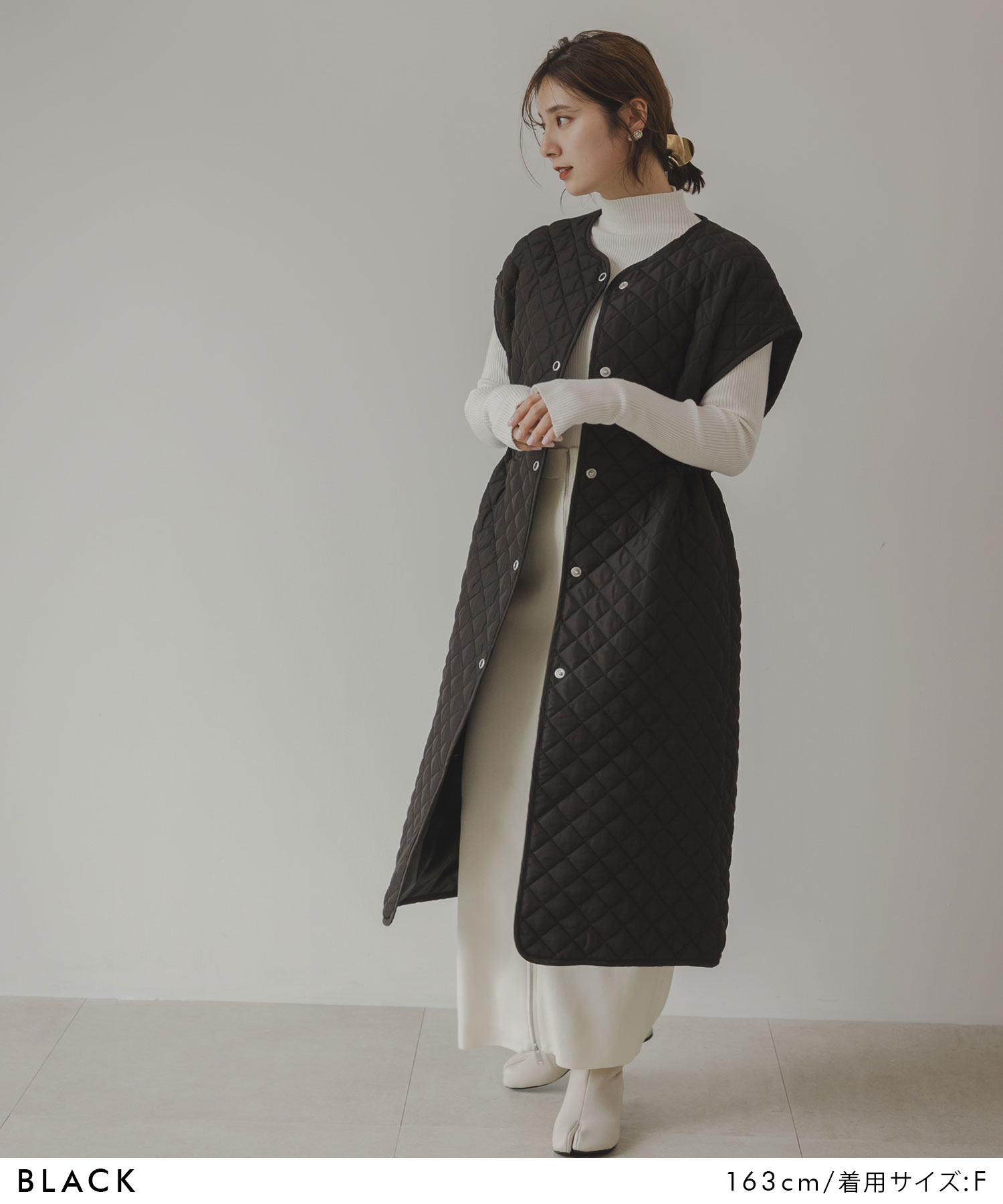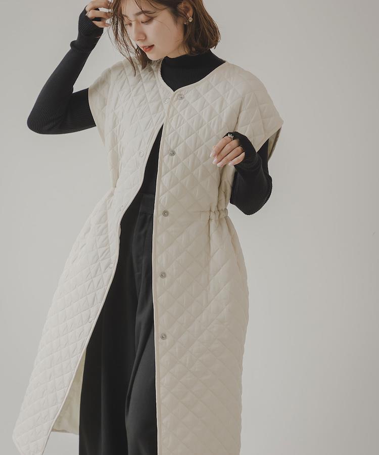 ドロスト仕様でシルエットを変えられるキルティングロングベスト【ディティール】シンプルで取り入れやすいキルティングデザインのロングベスト。中綿入りの程よい肉感で保温性もあり実用性高いアイテムです。ウエスト内側のドロストを絞ることでギャザー分量が調節可能ので、Iラインからフレアーラインまでアレンジ自在!ロング丈ながらもすっきりと着こなせるため、様々なボトムスにバランス良く合わせられます。アームホールを大きめに設定しているので、ボリュームニットももたつかず着用頂けます。すっきりとしたノーカラーデザインでタートルニットやバラクラバとの相性も抜群。アウターとのレイヤードコーディネートも今年らしくておススメです。**********************透け感:なし裏地:あり伸縮性:なし光沢感:なし生地の厚さ:普通**********************《生産国》中国