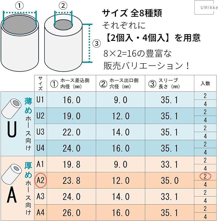 v商品名称に含まれる[23.8/12.0/35.0]は、「ホース差込側の穴の内径/ホース出先穴側の穴径/長さ(=適合サイズ) 単位:mm」を表しています。