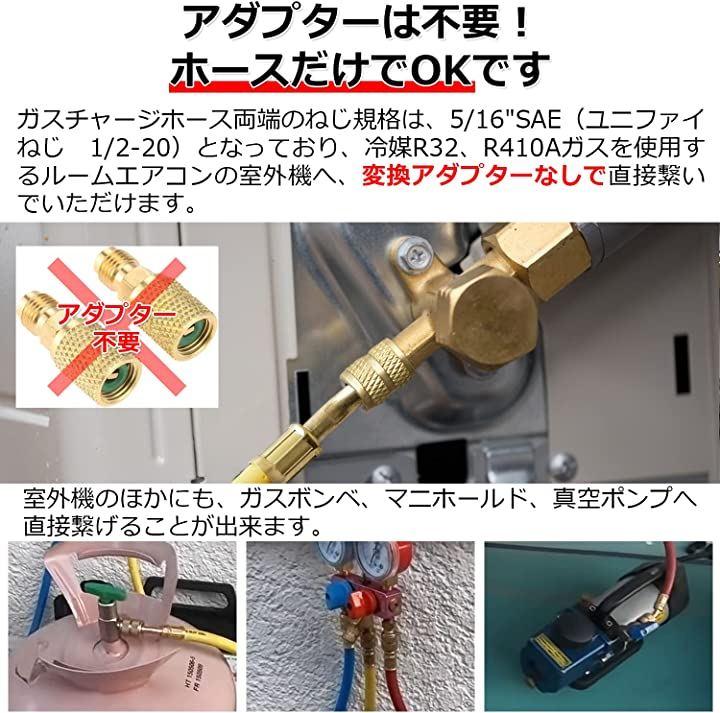 ・チャージホース両端のアダプタが5/16SAEであり、R410A,R32冷媒対応のエアコンの室外機に変換アダプタなしで接続できます。