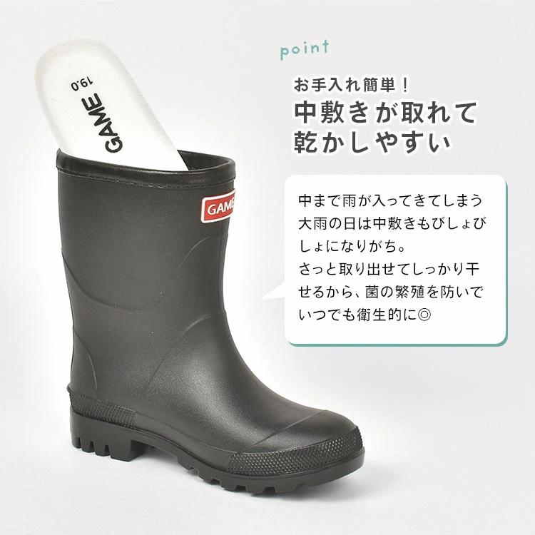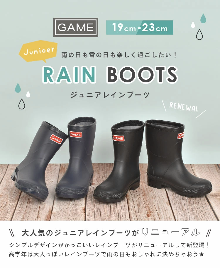 【レインブーツ】GAMEのキッズレインブーツがリニューアルして新登場!大人っぽいシンプルなデザインで男の子、女の子どちらでも使えます。親子でおそろいにする事も◎おしゃれなレインブーツで雨の日もおしゃれに決めちゃおう☆