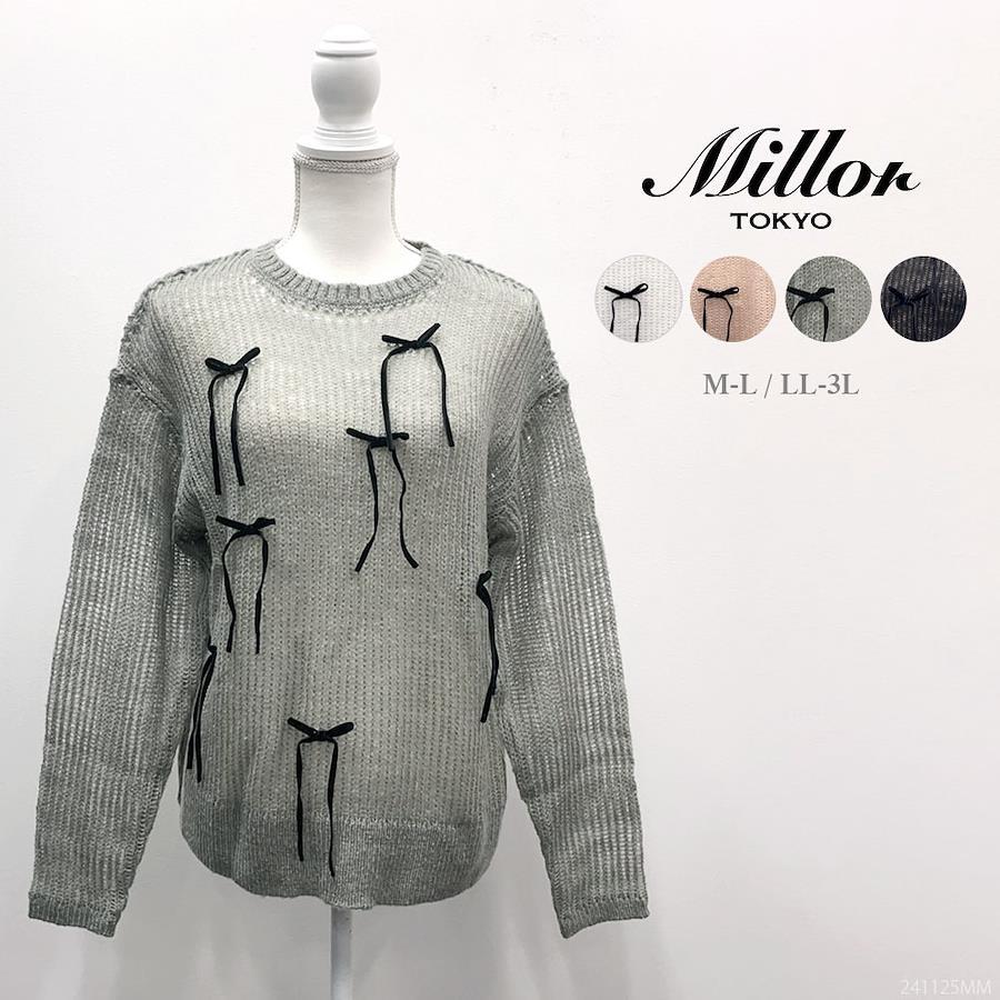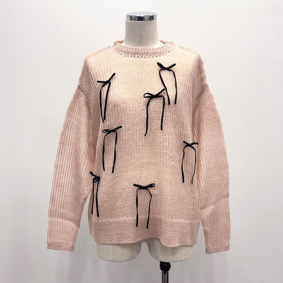 シーズンムード高まるレディライクなミニワンピ【デザイン】リメイクライクなデザインとシアーの透け感がこなれ感を演出してくれるアイテム。ゆったりとしたルーズなシルエットが女の子らしく、軽い着心地も魅力。ランダムに施したリボンはベロア素材でシーズンムードも高まります。バッククロスグリッタータンクトップと併せたコーディネートがおすすめです!【素材】ふわふわとした柔らかいニット素材です。《透け感》あり 《生地の厚さ》普通 《裏地》なし 《伸縮性》あり《生産国》中国