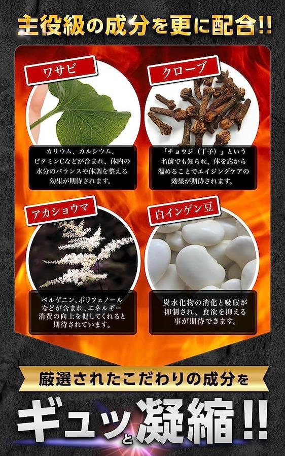原材料名:ガルシニアカンボジアエキス末(インド製造)、クローブエキス末 (クローブエキス、デキストリン)、白インゲン豆エキス末、アカショ ウマエキス末、ブラックジンジャーエキス末(ブラックジンジャーエ キス、デキストリン)、本わさび葉エキス末/セルロース、ステアリン酸カルシウム、微粒酸化ケイ素、シクロデキストリン