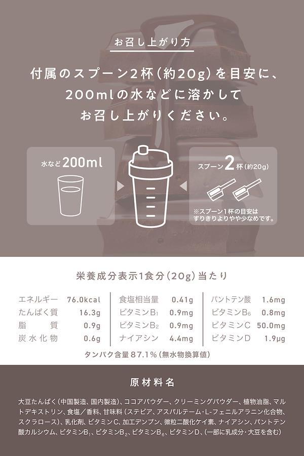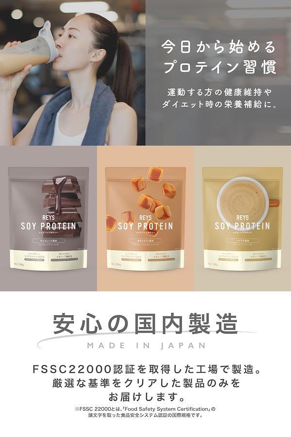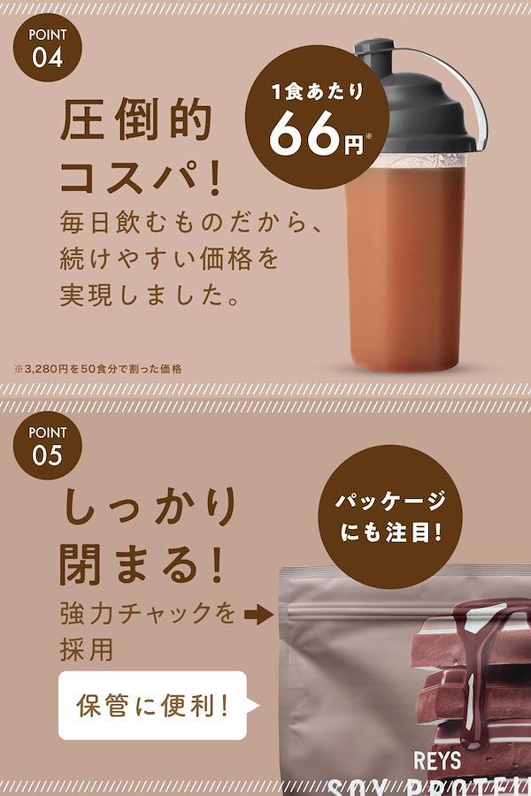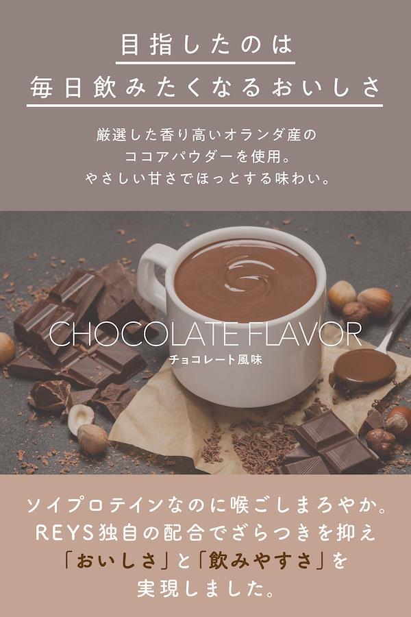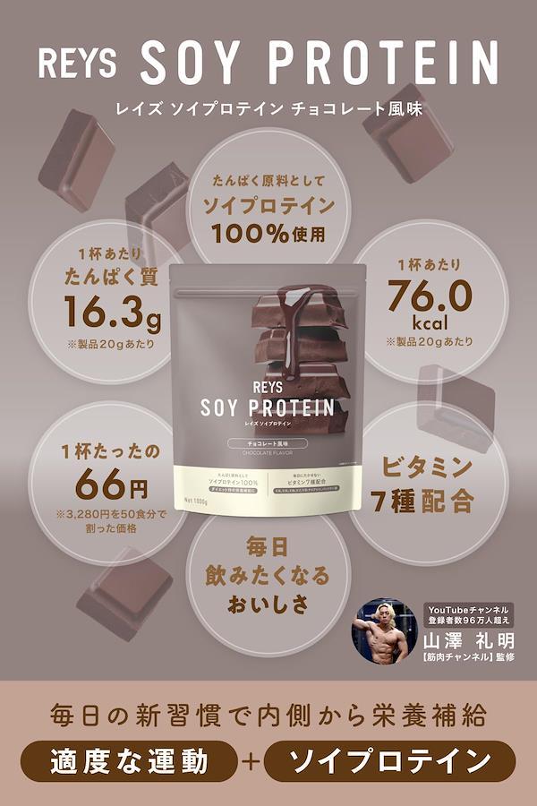 【毎日のためのソイプロテイン】YouTube登録者数97万人突破!山澤礼明監修のREYSよりソイプロテインが誕生!ソイプロテインなのに喉ごしまろやか。ざらつきを抑え、毎日飲んでも飽きないおいしさ。『味・溶けやすさ・お求めやすさ』を実現したソイプロテインが完成しました。水で美味しくお召し上がりいただけます。 【目指したのは毎日飲みたくなるおいしさ】■チョコレート風味:厳選した香り高いオランダ産のココアパウダーを使用。やさしい甘さでほっとする味わい。 【厳選されたソイプロテイン100%使用】たんぱく原料として大豆の植物性タンパク「ソイプロテイン」100%使用。1食(製品20g)あたりタンパク質16.3g。さらに毎日に欠かせない7種類のビタミン(V.B1,V.B2,V.B6,V.C,V.D,ナイアシン,パントテン酸)を配合。 【お召し上がり方】付属のスプーン2杯(約20g)を目安に、200mlの冷たい水などに溶かしてお召し上がりください。 【おすすめの摂取タイミング】目安:1日2回?3回 ■運動前後:トレーニング時の栄養補給に ■朝食時に:手軽にバランスアップ!■間食に:手軽にたんぱく質補給!■夜に:1日の終わりのたんぱく質補給に