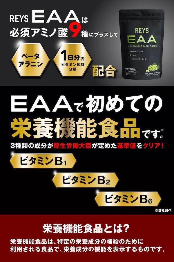 ?REYS EAAはYouTube登録者数90万人突破の山澤礼明が監修。20種類のアミノ酸のうち、体内では作り出すことができない9種類の必須アミノ酸を全種配合。さらにβアラニンと1日分のビタミンB群3種を加えたEAAでワンランク上のトレーニングをサポートします。 ?EAA8,000mg配合|ロイシン2,400mg、イソロイシン1,200mg、バリン1,200mg、トレオニン640mg、リジン1,360mg、メチオニン280mg、ヒスチジン280mg、フェニルアラニン560mg、トリプトファン80mg/1食(12g)当たり|さらにβ-アラニン800mgと1日分のビタミンB1、ビタミンB2、ビタミンB6を配合 ?98%が美味しいと回答!REYS EAAは美味しさをとことん追求しました。REYS独自の配合でアミノ酸の苦味や匂いを抑え、ジュース感覚で飲んでいただける美味しいEAAができました! ?【お召し上がり方】付属のスプーン1杯程度を目安に、300?400mlの冷たい水などに溶かしてお飲みください。【おすすめの摂取タイミング】トレーニング時のワークアウトドリンクとして/朝に ?REYS EAAは栄養機能食品です。●ビタミンB1は、炭水化物からのエネルギー産生と皮膚や粘膜の健康維持を助ける栄養素です。●ビタミンB2は、皮膚や粘膜の健康維持を助ける栄養素です。●ビタミンB6は、たんぱく質からのエネルギーの産生と皮膚や粘膜の健康維持を助ける栄養素です。